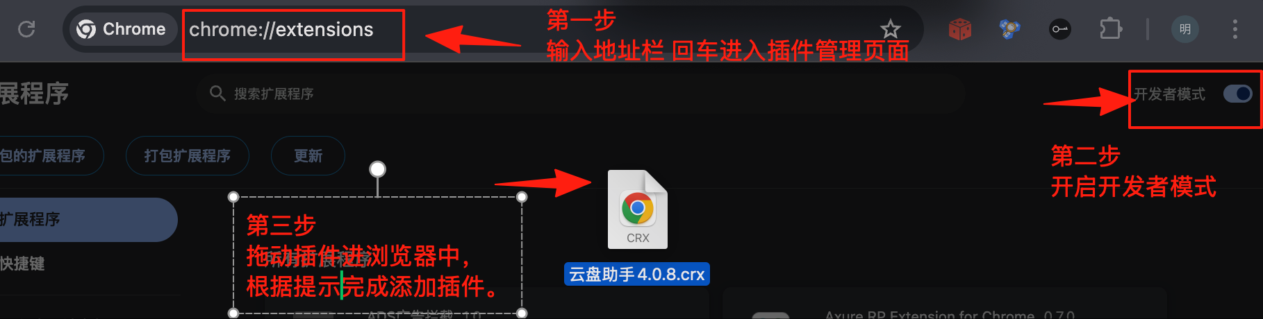 点击菜单后展开后 选择我的扩展 把插件拖进去 拖进去以后会提示您是否要安装这个扩展程序 点击 添加扩展程序